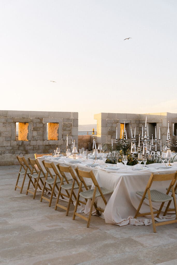 Pour sublimer ce cadre brut et spectaculaire, j’ai imaginé une scénographie mêlant l’élégance du textile à la sobriété naturelle des teintes claires. Le fil conducteur : la légèreté. De grands voiles en drapé fluide ondulaient au vent, créant un jeu d’ombres et de mouvements, comme une danse silencieuse entre les éléments.