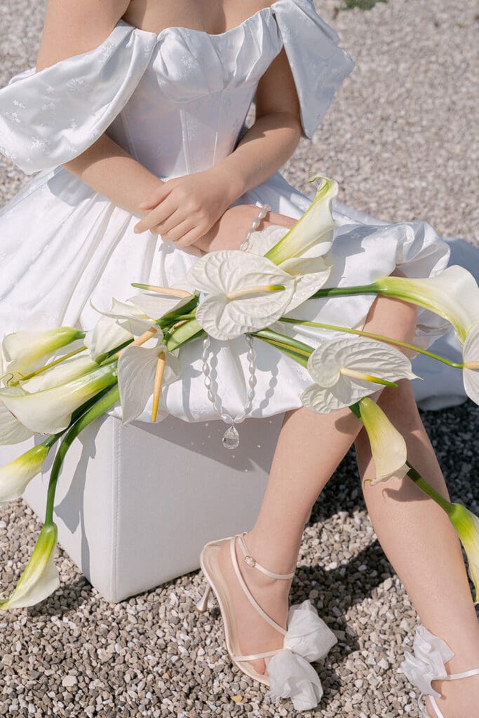 La palette, volontairement douce et nuancée, explorait des tons nude et neutres — ivoire, sable, lin, blush — avec une pointe de bordeaux profond pour apporter du contraste, de la chaleur et un souffle plus intense. Ce bordeaux, utilisé avec parcimonie dans certaines fleurs et accessoires textiles, soulignait l’ensemble sans l’alourdir.
