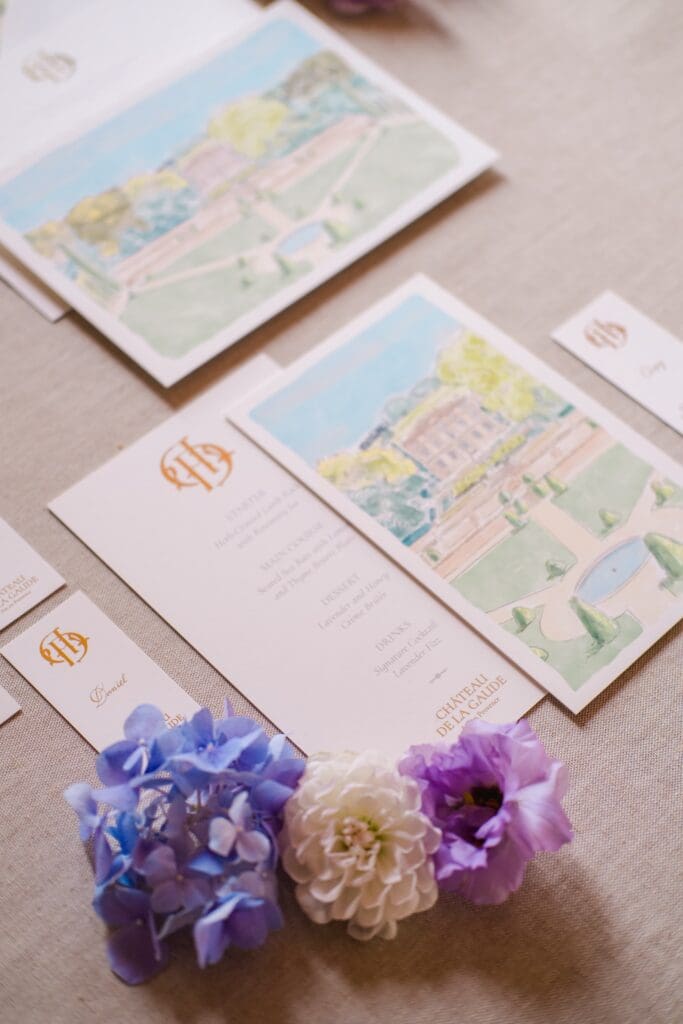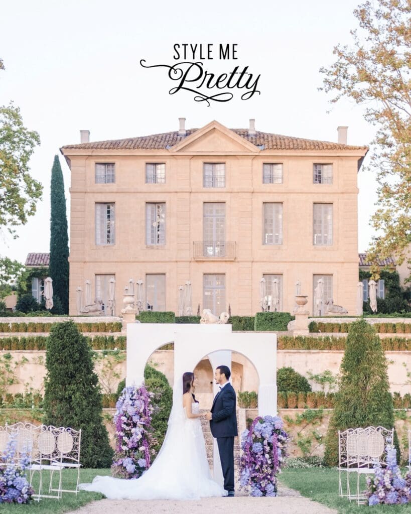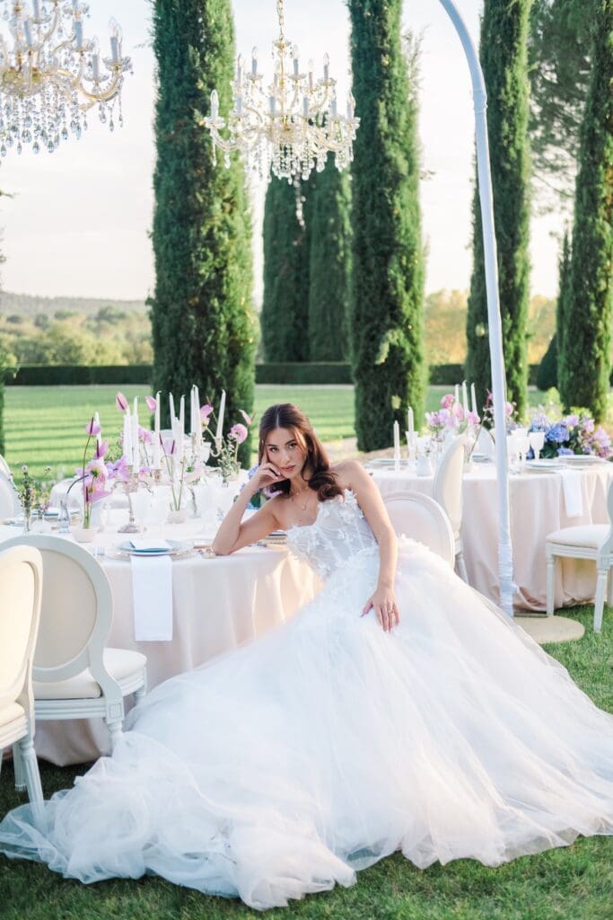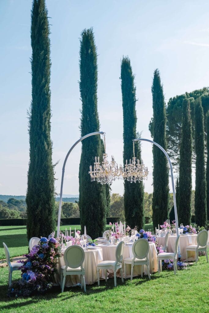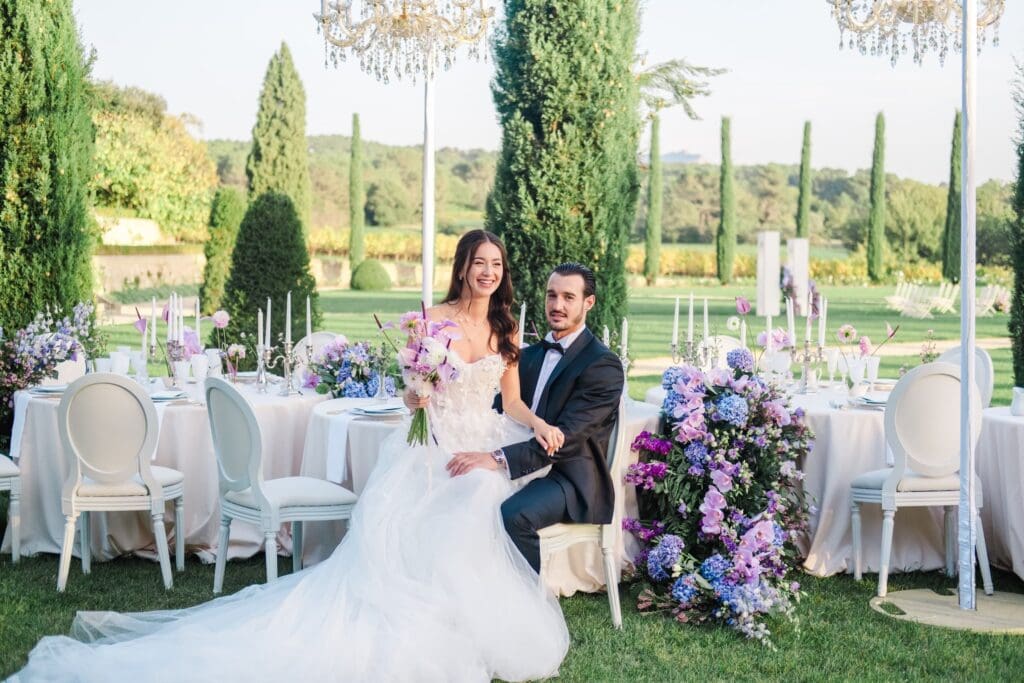 Pour ce mariage, j’ai imaginé une scénographie inspirée des couleurs de la Provence, articulée autour d’une palette de violets : lavande, lilas, parme, mauve et aubergine. Ces tonalités, à la fois douces et profondes, ont apporté une ambiance romantique et contemporaine, en parfaite résonance avec l’atmosphère du domaine.