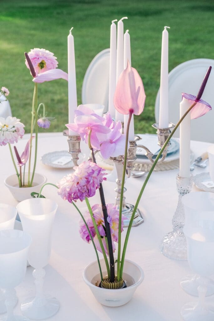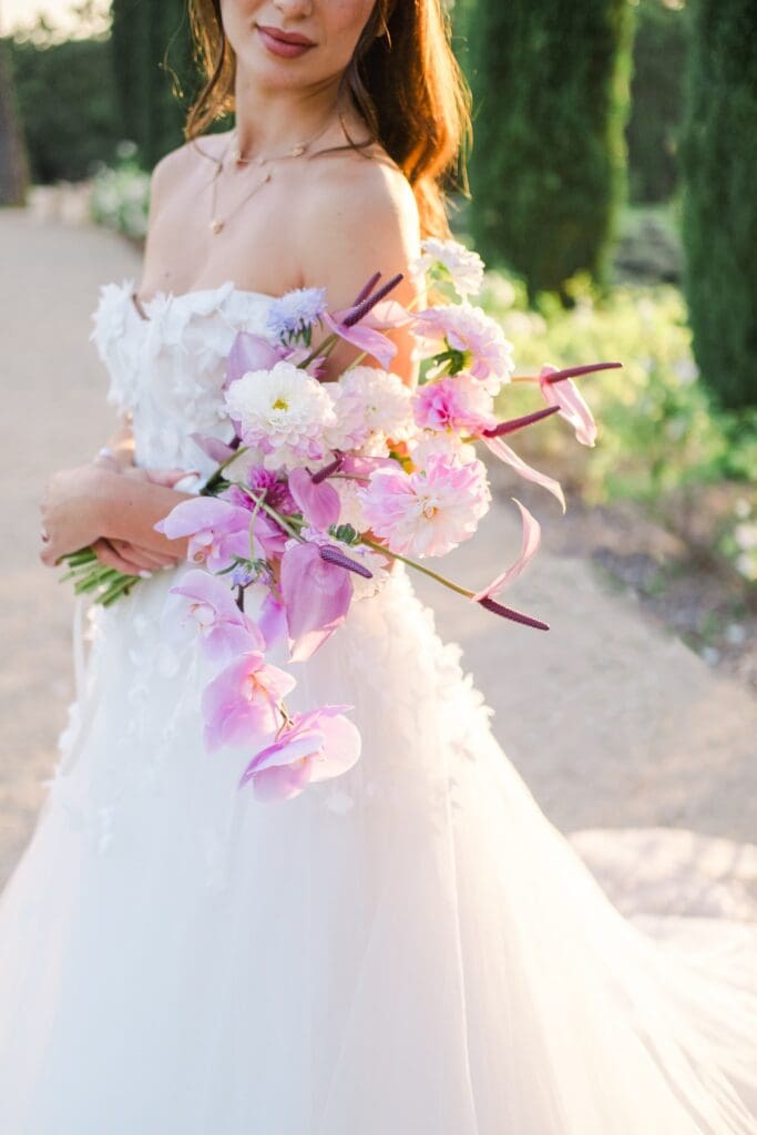 Les compositions florales ont joué un rôle central : pivoines généreuses, dahlias, lisianthus et touches de lavande ont été travaillées avec finesse pour souligner l’élégance naturelle du lieu. La cérémonie s’est déroulée sous une arche florale légère, dans les jardins, face aux vignes. Le dîner, quant à lui, s’est tenu en extérieur, sous une pluie de guirlandes lumineuses, dans une ambiance chaleureuse et feutrée.