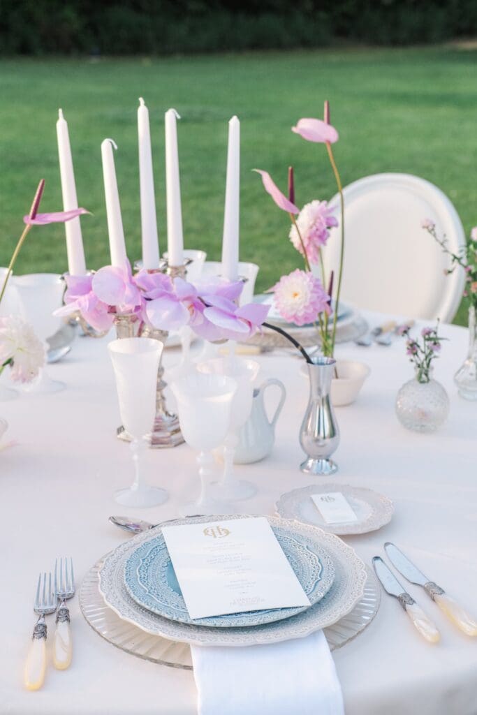 Papeterie sur-mesure, bougies dans des contenants en verre fumé, linge en lin naturel, art de la table soigné — chaque détail a été pensé pour raconter une histoire, celle de deux âmes s’unissant avec simplicité et intensité.
